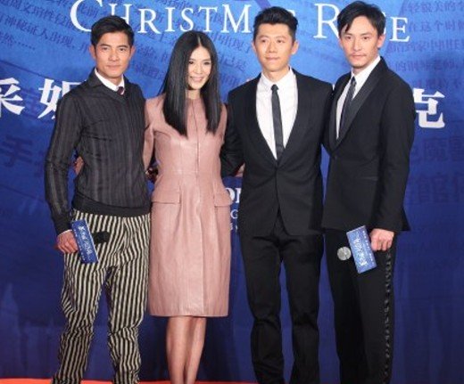 郭富城(左起)、导演杨采妮、夏雨、张震出席《圣诞玫瑰》发布会(图片来自网络)