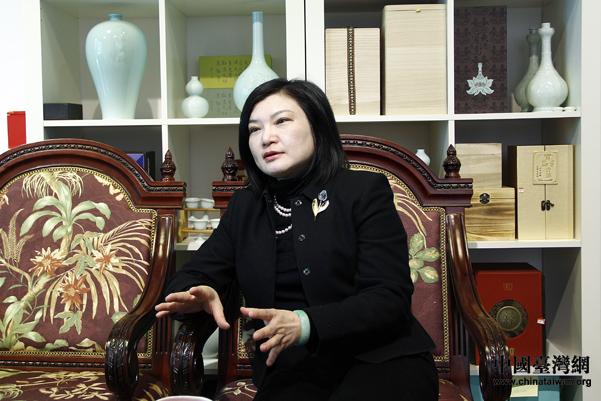 北京玉山高商贸有限公司总经理陈艳媚介绍台湾高粱酒。(中国台湾网 王伟 摄)