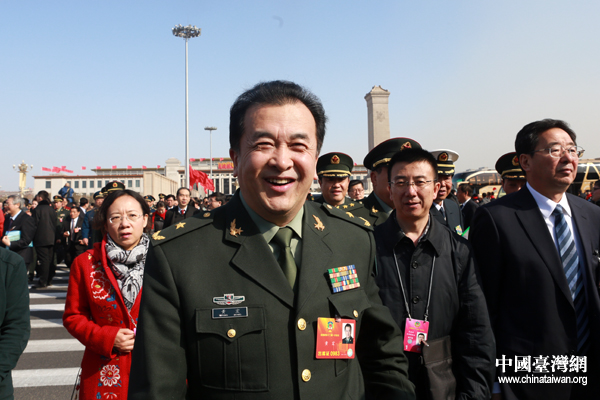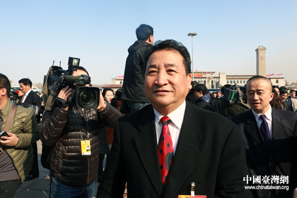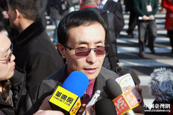开幕会举行前,政协委员巩汉林在人民大会堂前遭遇各路记者围追堵截。(中国台湾网 于斯文 摄)