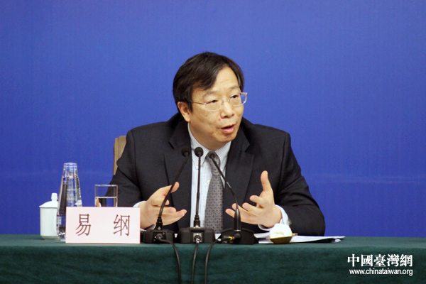 中国人民银行副行长、国家外汇管理局局长易纲今天表示,考虑到两岸贸易投资的发展有比较多的需求,未来有必要的话,可以商谈两地的货币互换协议。(中国台湾网 何建峰 摄)
