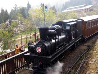 主办单位今天也出动阿里山蒸汽老火车头拖挂4节桧木车厢出场,当冒着蒸汽的火车头穿越樱花树下时,吸引游客争相猎取镜头,开启了阿里山花季的序幕。(中国台湾网 周剑)
