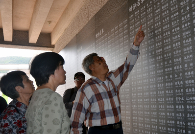 台当局文化主管部门负责人龙应台(中)16日陪着政治受难者张常美(左 )和郭振纯(前右)重返绿岛,看着当年白色恐怖时期的枪决名单。(图片来自台媒)