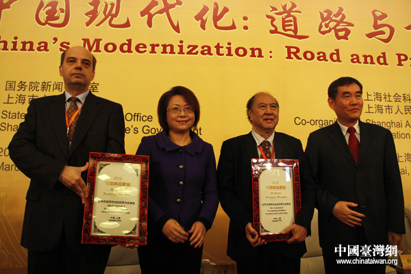 中国台湾网3月24日上海消息 以“中国现代化:道路与前景”为主题的第五届世界中国学论坛23日在上海开幕。开幕式上,上海市人民政府副市长翁铁慧揭晓了第二届“世界中国学贡献奖”,该奖项的获得者是:俄罗斯科学院院士、俄罗斯前特命全权驻华大使齐赫文斯基,美国费正清研究中心前主任傅高义和香港中文大学中文系荣休讲座教授饶宗颐。