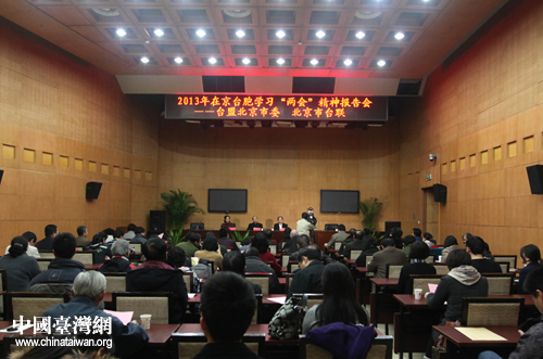 2013年在京台胞学习全国和北京市“两会”精神报告会于3月23日举行,台盟中央副主席、北京市台联会长苏辉、全国台联副会长纪斌等出席。(北京市台联供图 裴芝荣 摄)