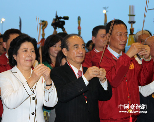 山西省委常委、宣传部长胡苏平,台湾立法机构负责人王金平,台湾鸿海科技集团董事长郭台铭拜祭关公祖庙圣像。(中国台湾网 李典典 摄)