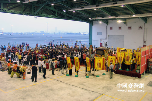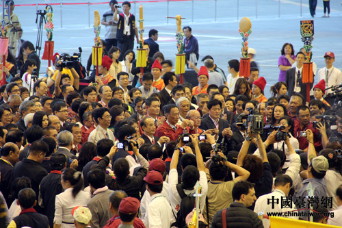 中国台湾网3月30日高雄消息 山西关公祖庙圣像接驾仪式29日下午在台湾高雄小港国际机场隆重举行。台湾立法机构负责人王金平、台湾鸿海科技集团董事长郭台铭、中华道教关圣帝君弘道协会总会长陈展松等亲迎圣像。(中国台湾网记者 李典典)