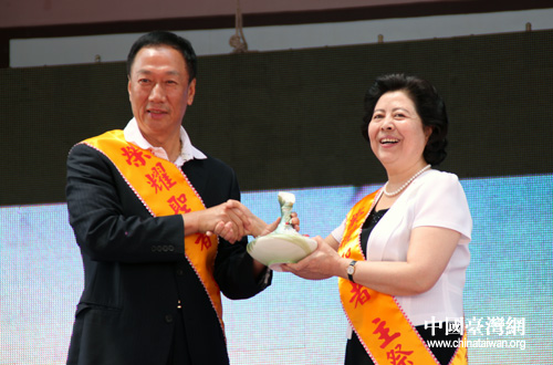 中共山西省委常委、宣传部部长胡苏平与郭台铭互赠礼物。(中国台湾网 李典典 摄)