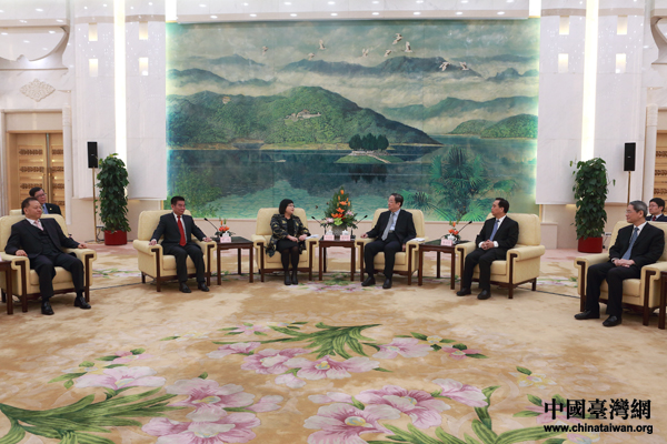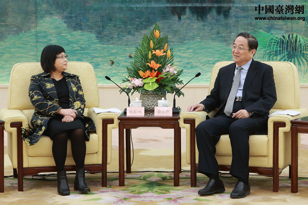 中共中央政治局常委、全国政协主席俞正声17日上午在北京人民大会堂会见了出席“2013海峡两岸工会论坛”的台湾工会界主要代表。图左为海峡两岸劳工发展交流协会理事长侯彩凤。(中国台湾网 于斯文 摄)