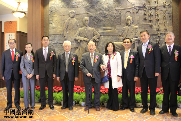 “林献堂抗日事迹陈列馆”暨北京五桂楼会馆开馆仪式4月28日在北京台湾街五桂楼举行。梁启超之子梁思礼、林献堂孙媳林芳媖以及十一届全国人大常委会副委员长周铁农、台中市副市长蔡炳坤在“梁启超与林献堂浮雕”前合影。(中国台湾网 何建峰 摄)