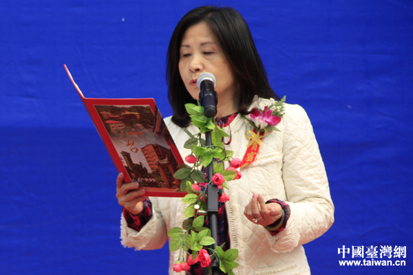 “林献堂抗日事迹陈列馆”暨北京五桂楼会馆开馆仪式4月28日在北京台湾街五桂楼举行。图为林献堂孙媳林芳媖致辞。(中国台湾网 何建峰 摄)