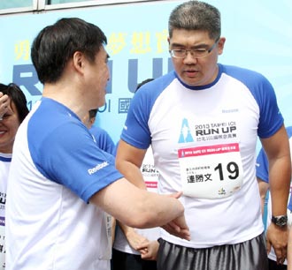 台北市长郝龙斌(左)上午带领经发会副召集人连胜文(右)等市政府局处首长代表,参加2013台北101国际登高赛,赛后两人握手致意。图片来自台湾《联合报》