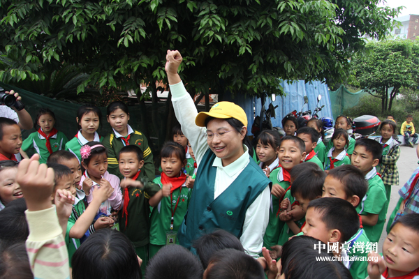 顶新公益基金会副秘书长周淑祯带领普安小学的孩子们做游戏(中国台湾网 李徽 摄)