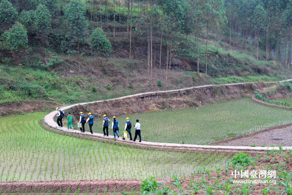 来自顶新集团的中高层们从普安小学步行一小时左右前往探望家访留守儿童(中国台湾网 李徽 摄)
