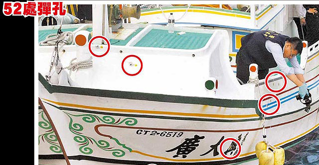 “广大兴28号”渔船11日凌晨被拖返屏东小琉球渔港,调查人员清点发现船身共有52处弹孔。红圈处为弹孔位置。(图片来自台媒)