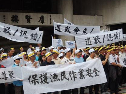 蔡天裕在与渔民们共同陈情时做如上表述。陈情渔民们情绪都非常激动,高喊“血债血偿、一命抵一命、杀人偿命”。(中国台湾网 李帅)