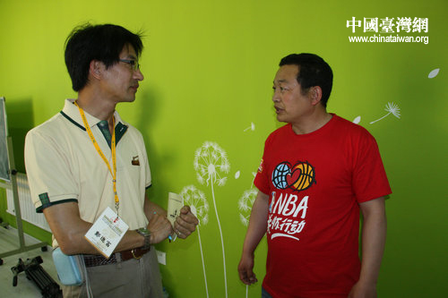 来自台湾的郑近富先生与黄庄学校校长交流学生教育问题。(中国台湾网 郭莹莹 摄)