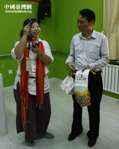 陈培纶女士向陈校长赠送由台湾学生手工制作的娃娃。(中国台湾网 郭莹莹 摄)