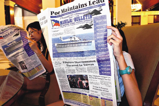 菲律宾报纸今日以头版报导菲射杀台湾渔民事件,内容引述菲律宾海防队报告,反指是台湾渔船拒捕冲撞。图为菲律宾民众阅读相关报道。(图片来源:台湾《联合晚报》)