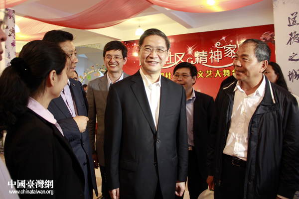 17日下午,在昆山调研察的中台办、国台办主任张志军走进普通居民区,探望在此居住台胞的生活情况,图为张志军在社区工作人员陪同下参观居民活动室。(中国台湾网 杨丽 摄)