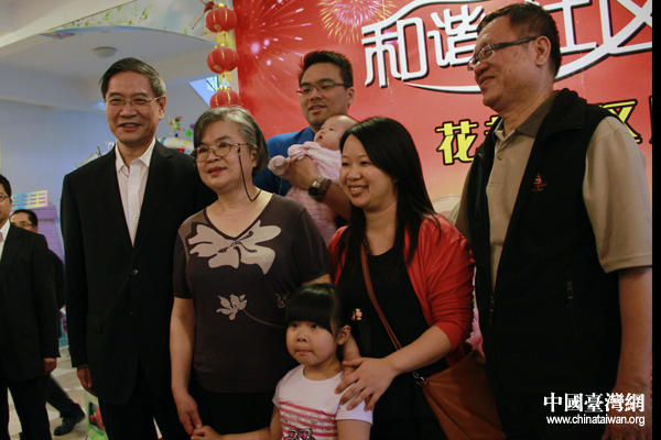 中台办、国台办主任张志军应邀与花都社区的台胞一家合影。(中国台湾网 杨丽 摄)