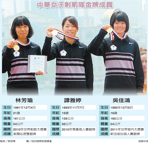 体坛“台湾日”昨天由3名平均年龄20岁的女子团体揭开序幕,谭雅婷、吴佳鸿、林芳瑜连手在2013年射箭世界大奖赛上海站团体组射下金牌。