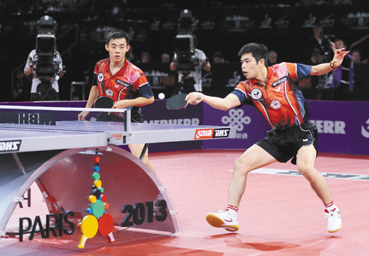中华台北乒乓球男双搭档陈建安(左)与庄智渊,在巴黎世乒赛击败大陆对手马琳/郝帅夺冠。(图片来自台媒)