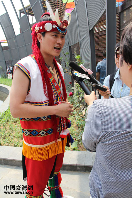 园博台湾园里,阿美族小伙对记者唱起了民族歌曲。(中国台湾网 黄艳艳 摄)
