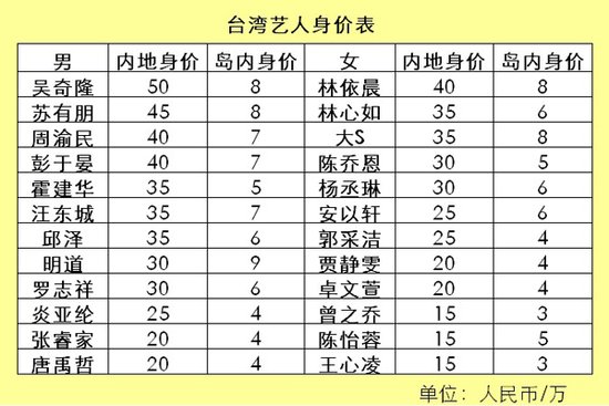 大陆网友日前在微博上疯传一份“台湾艺人身价表”,指台湾艺人在大陆拍片片酬是台湾的5倍,例如吴奇隆在台湾拍电视剧,1集只拿人民币8万元,在大陆1集人民币50万元。林心如在台1集6万、在大陆1集35万元。