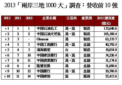 2013“两岸三地1000大”调查:营收前十强,台企仅一家上榜。(图片来自台媒)