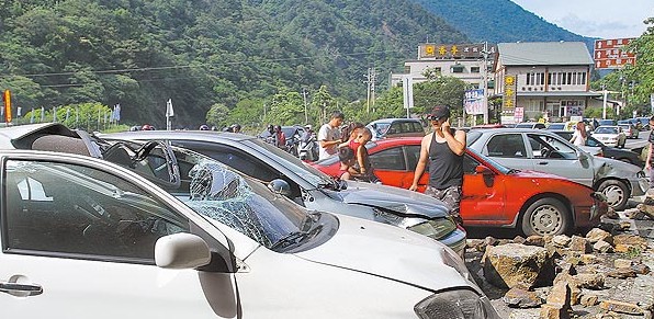 台湾南投县台14线观音瀑布路段,停靠路边的数辆车,被地震时滚落的石块砸毁。(图片来自台媒)