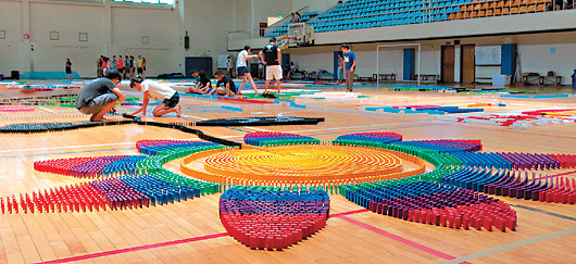 台湾交通大学机械系学生花18个小时,用7000多片骨牌堆成机械系学生心中的英雄“钢铁人”和一栋大楼,当骨牌倒下时,钢铁人就像发射出一道强力将大楼震倒,震撼视觉效果娱乐性十足,掌声不断。