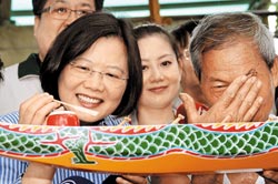 前民进党主席蔡英文(左)6日拜会龙舟师傅刘清正(右),对桧木做的小小划桨很感兴趣。有关“会计法”修法争议,她认为是迫在眉睫的价值危机。(来源:台湾《中国时报》)