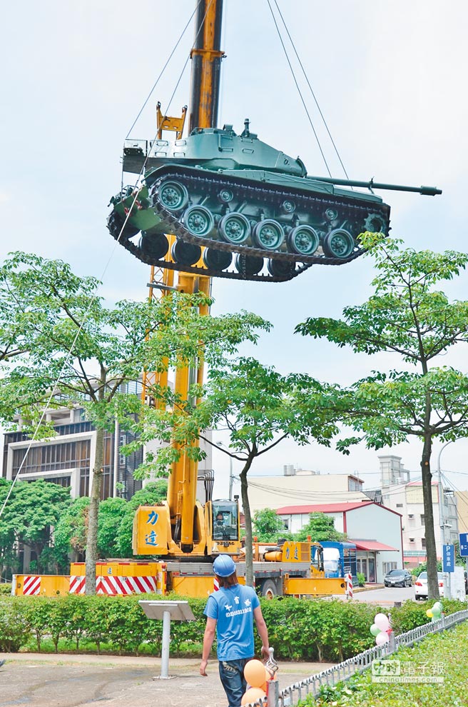 昨(6)日下午,工作人员动用2部吊车,才将这辆从龙潭运动公园运来的M41摆放就位,不但让战车难得出现台北市区和自由广场,还上演少见的坦克吊挂秀。