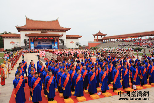 中国台湾网6月14日莆田消息 6月14日上午,来自台湾179家妈祖宫庙的970名信众代表在湄洲祖庙天后广场参加了妈祖祭祀大典。台湾信众身着传统服装,行三跪九叩祭拜之礼,在妈祖金身前,同祈两岸福祉。