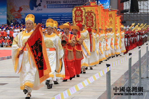 6月14日上午,来自台湾179家妈祖宫庙的970名信众代表在湄洲祖庙天后广场参加了妈祖祭祀大典。(中国台湾网 樊玉娇 摄)