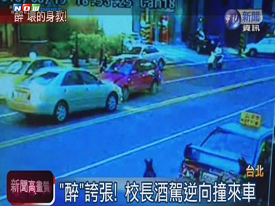 台北一小学校长酒驾逆向撞红色轿车,还倒车试图肇事逃逸被民众拦下。(图片来自台媒)