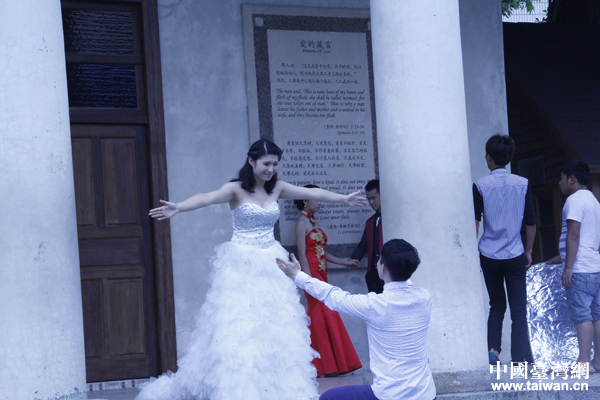 在鼓浪屿协和礼拜堂前拍婚纱照的新娘(中国台湾网 芜同 摄)
