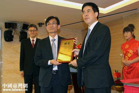 陈东荣为当选监事长的严世杰颁发当选证书。(中国台湾网 王思羽 摄)