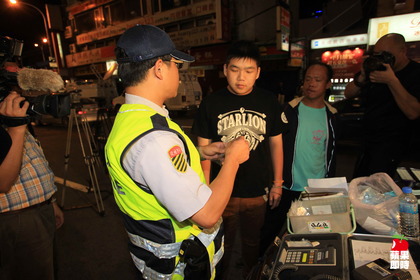 被拦下民众进行酒测吹气动作。(图片来自台媒)