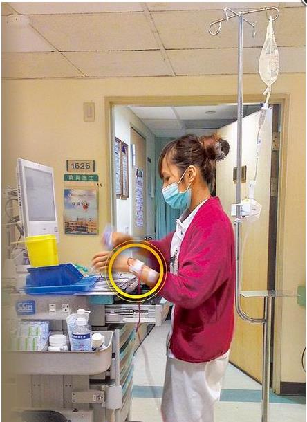 花莲门诺医院方姓护士肠胃不适,吊着点滴上大夜班,因不停工作,造成点滴管出现血液逆流情形,被病患家属拍下贴网。(图片来自台媒)