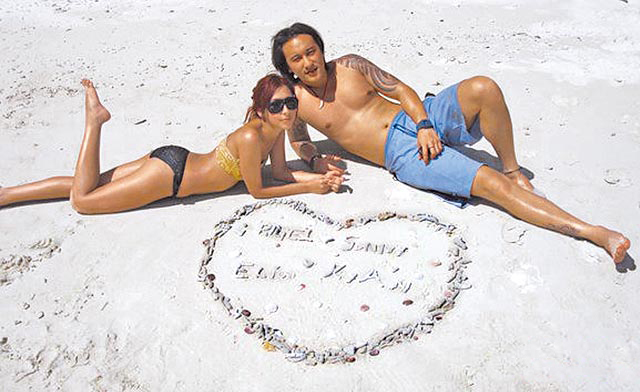 王阳明(右)2009年在沙滩上裸上身和穿比基尼的程颖婕亲密合照。(图片来自台媒)