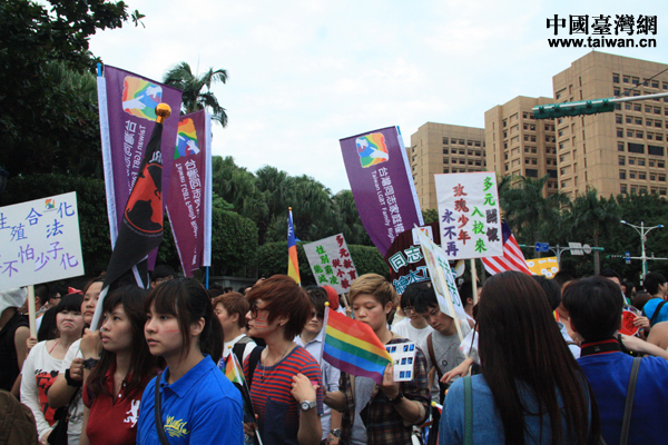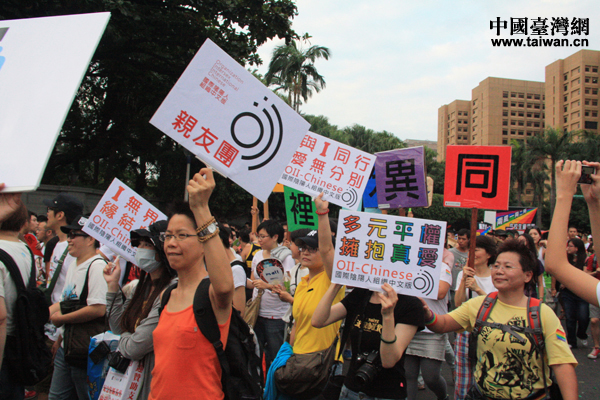 2012年10月27日,第10届台北同志大游行从台北市凯达格兰大道出发,诉求“婚姻平权、性别多元”。(中国台湾网 王文英 摄)