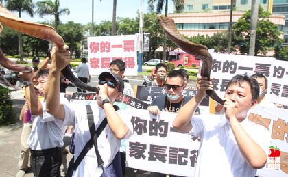 台湾反12年教育政策团体到“立法院”,以吹号角形式抗议。(图片来自台媒)