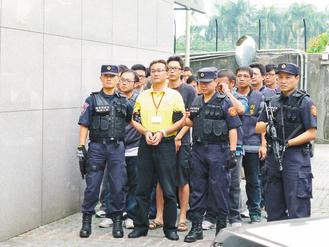 “白狼”张安乐将返台,传黑道可能大阵仗接机,台“刑事局”昨天起扫黑;被视为是张安乐嫡系人马的竹联地堂大哥许伯奖(黄衣)被检肃到案。(图片来自台媒)