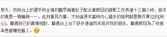 孟庭苇在微博中写道:那天,我与台上的选手和全场的观众饿着肚子配合着节目的录影工作长达13个小时,换来的竟是一场骗局……。此刻看见内幕,才知道原来当时内心诸多的疑问都是制作单位的“用心”,难过自己的真情相对、难过台上台下许多远道而来陪伴我的朋友,难过节目为了收视率恶意牺牲艺人。 (图片取自孟庭苇微博)