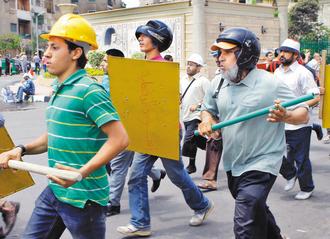埃及总统穆尔西的政权岌岌可危,支持者二日戴头盔,手持棍棒、盾牌,在总统府附近的清真寺外参加集训,准备挺身保护总统。来源:台湾“中广新闻网”