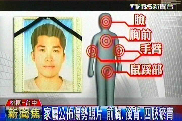 中国台湾网7月10日消息 据台湾TVBS电视台报道,台陆军下士洪仲丘,退伍前3天在军中暴毙,台军方称是关禁闭时体能训练导致热衰竭死亡。而台当局防务主管部门出示的相验尸体证明书,写的为“意外死”,死亡原因是“热性伤害”和“体能训练”导致多重器官衰竭,家属公布洪仲丘的伤势照片,全身瘀青,质疑台军施虐。