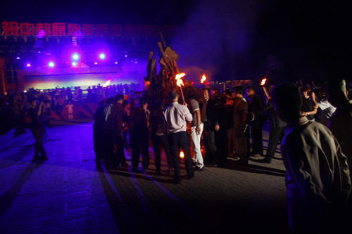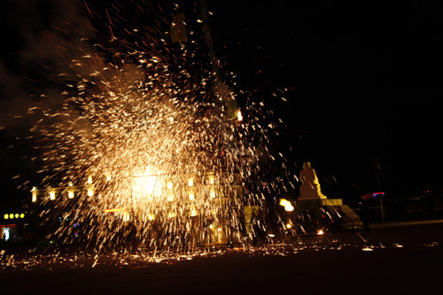 在篝火晚会现场,蒙古族勇士表演打树花,将1600度的铁水泼向天空,形成美丽的火花(中国台湾网 芜同 摄)