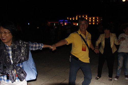 参加篝火晚会的台湾嘉宾完全融入了跳舞的人群中(中国台湾网 芜同 摄)