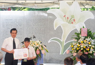 马英九(左)15日前往台北市介寿公园“白色恐怖政治受难者纪念碑”,出席“2013年戒严时期政治受难者纪念追思仪式”,颁发回复名誉证书给受难者和家属。图片来源:台湾“中央广播电台”